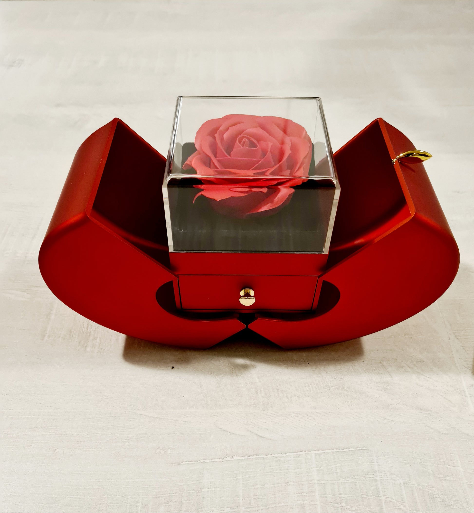 This beautiful heart-shaped jewelry box is not only an eye-catcher, but also a unique gift idea. The box opens in a special way, with a delicate artificial rose appearing first, creating a magical effect. The artificial rose symbolizes love and beauty, making this jewelry box perfect for romantic occasions.