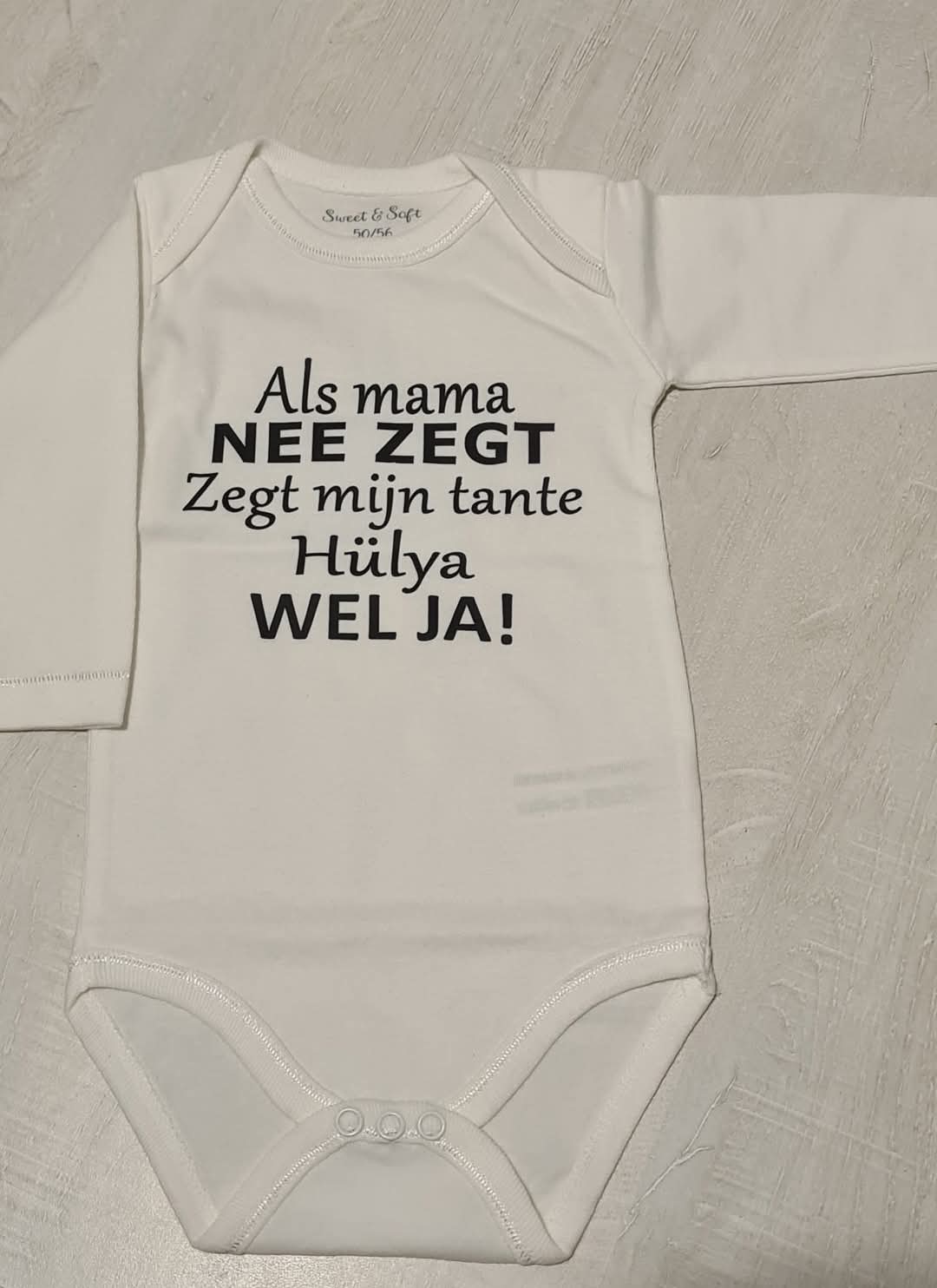 What makes this romper extra special is the possibility to personalize it with your own print . Whether you choose your baby's name, a cute message, or a funny text, this romper will become a unique keepsake that gives your baby a stylish look.