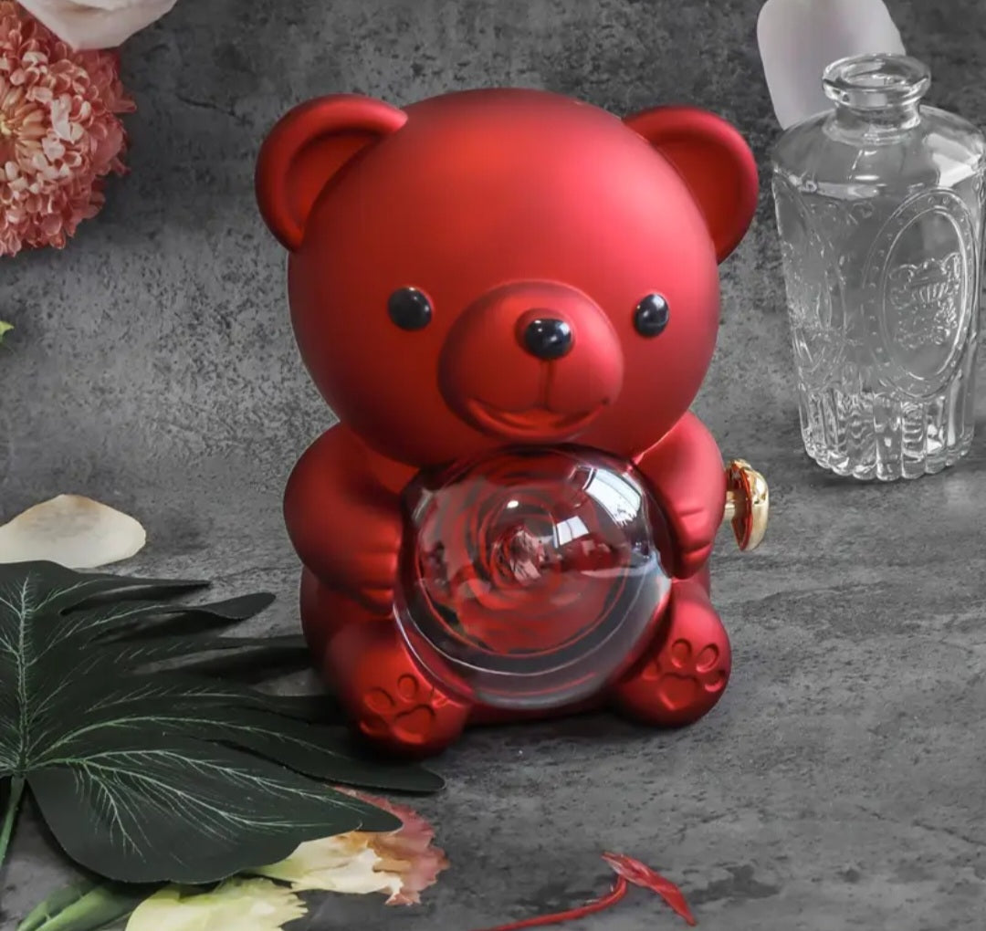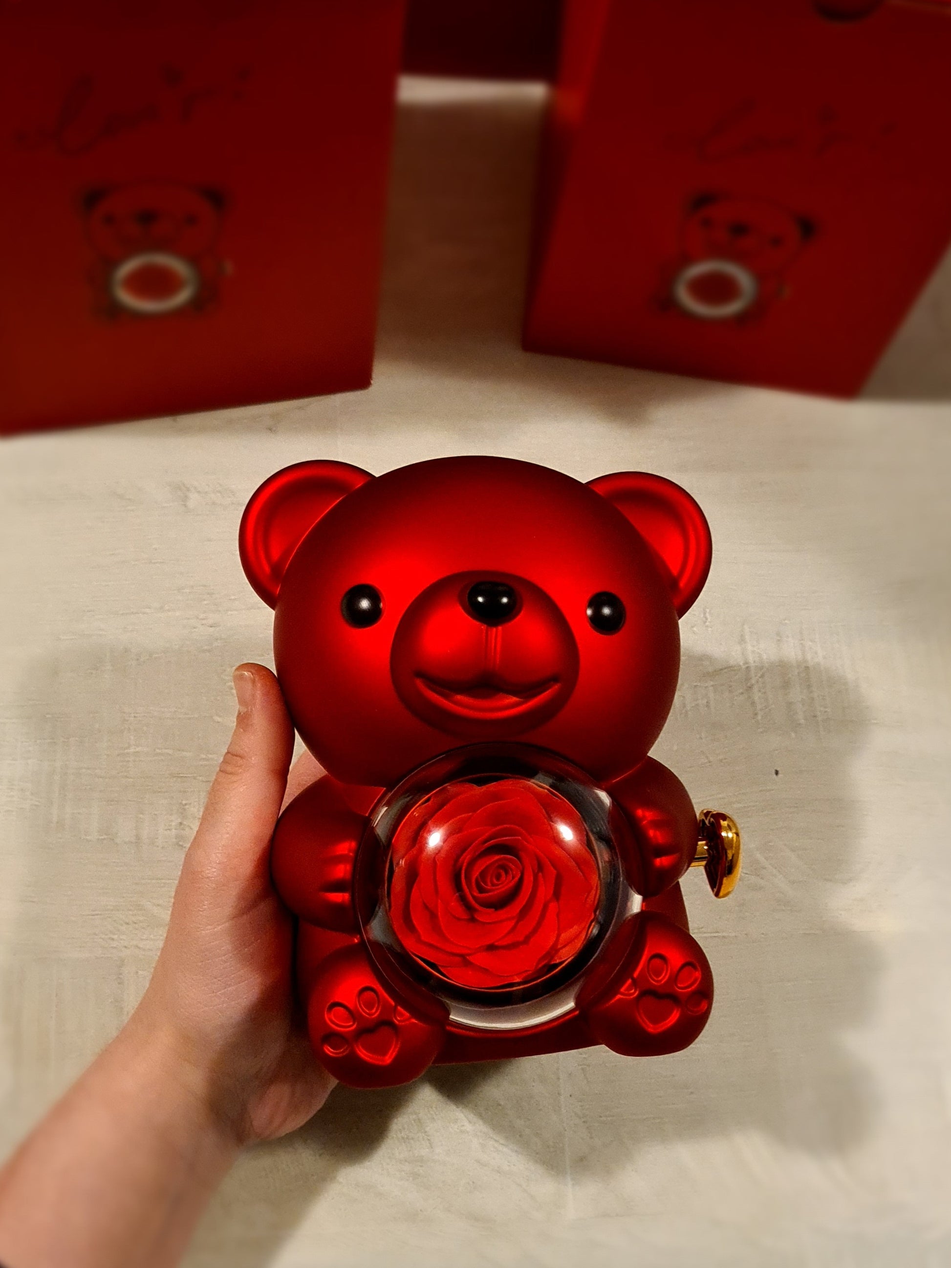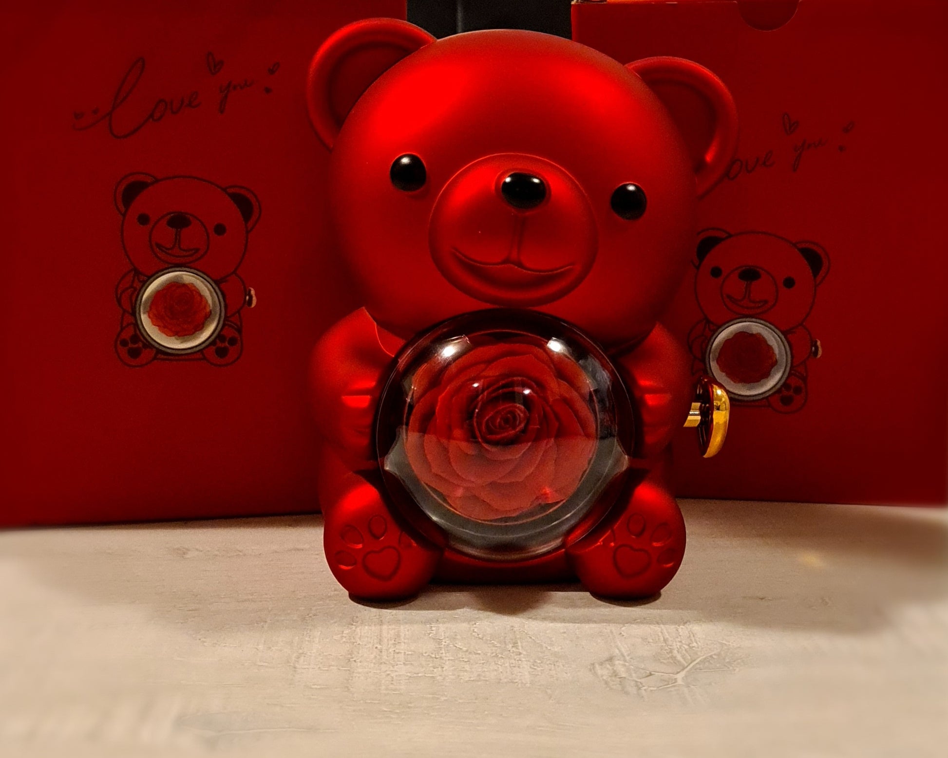 - Plastic red teddy bear with a soft look and a rose that he lovingly holds.