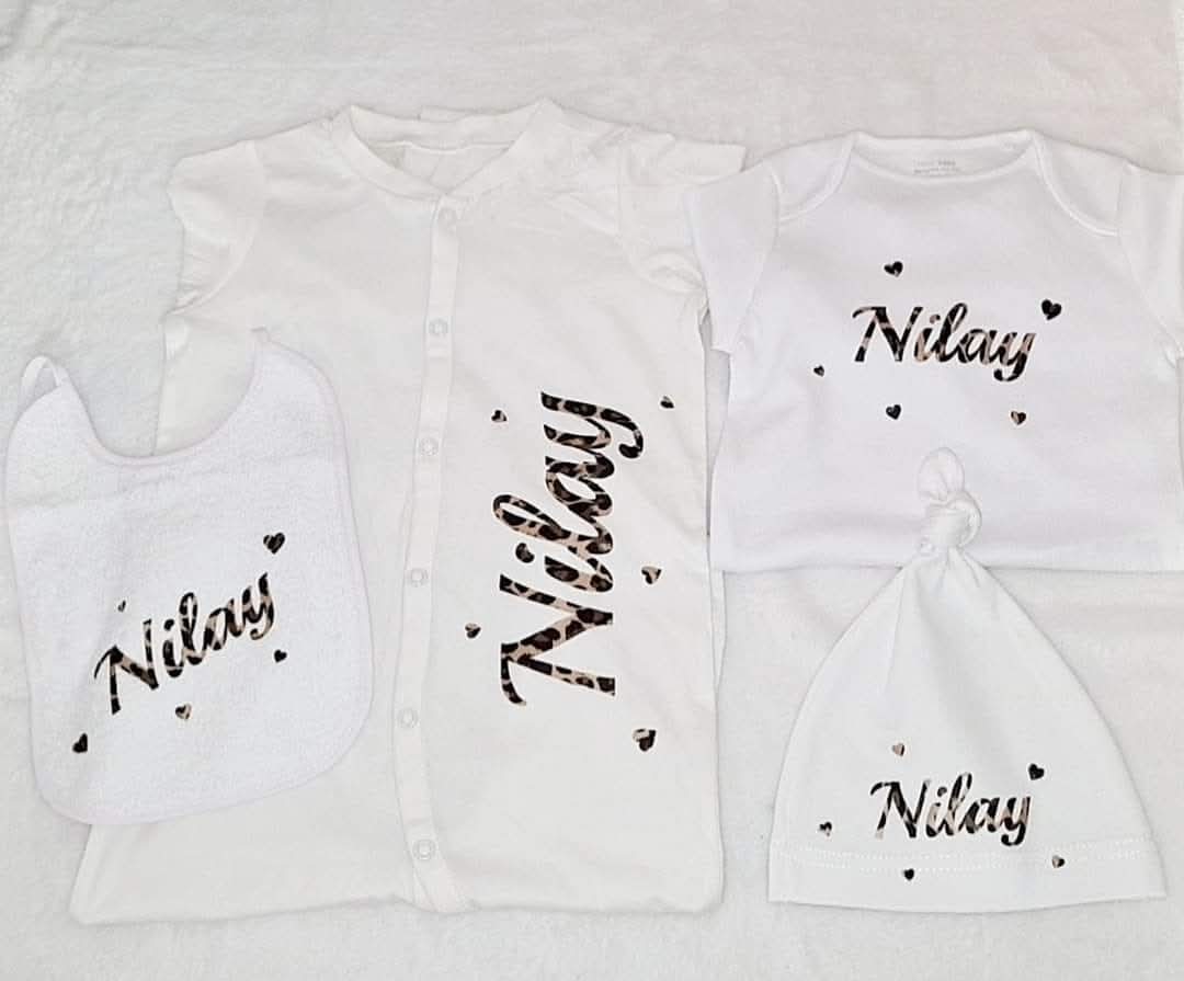 This adorable baby set contains everything you need to dress and care for your little one in style. The set includes a sleepsuit , bodysuit , hat, and bib , all of which can be personalized with your baby's name for an extra special touch. Perfect for a baby shower, as a newborn gift, or simply to spoil your own baby in a unique way.