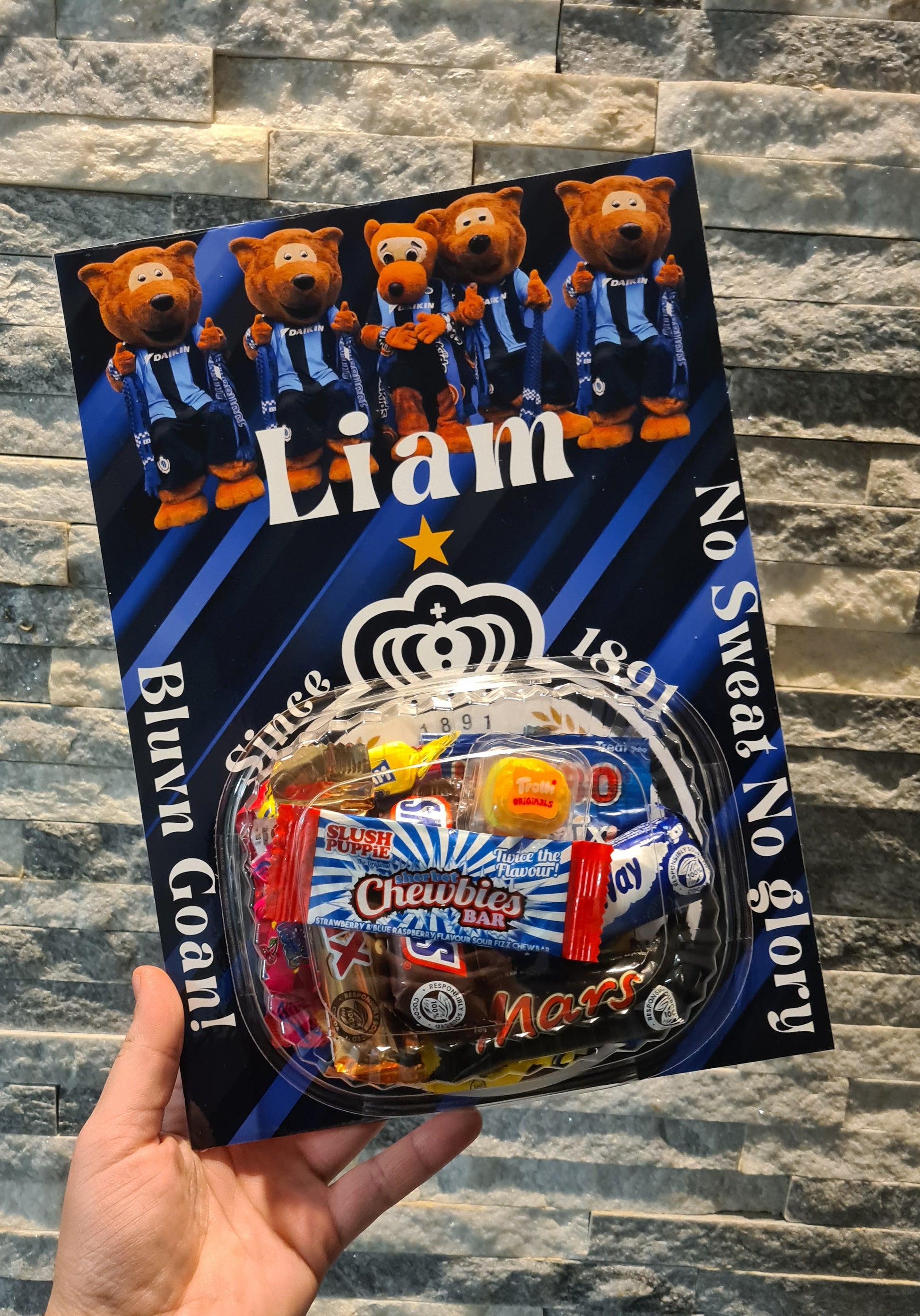 Het is een stevig, glanzend kaartbord met een leuke, persoonlijke boodschap (zelfs met je eigen foto of favoriete voetbalclub 😍) én heerlijk snoepgoed erbij. 🍬💖