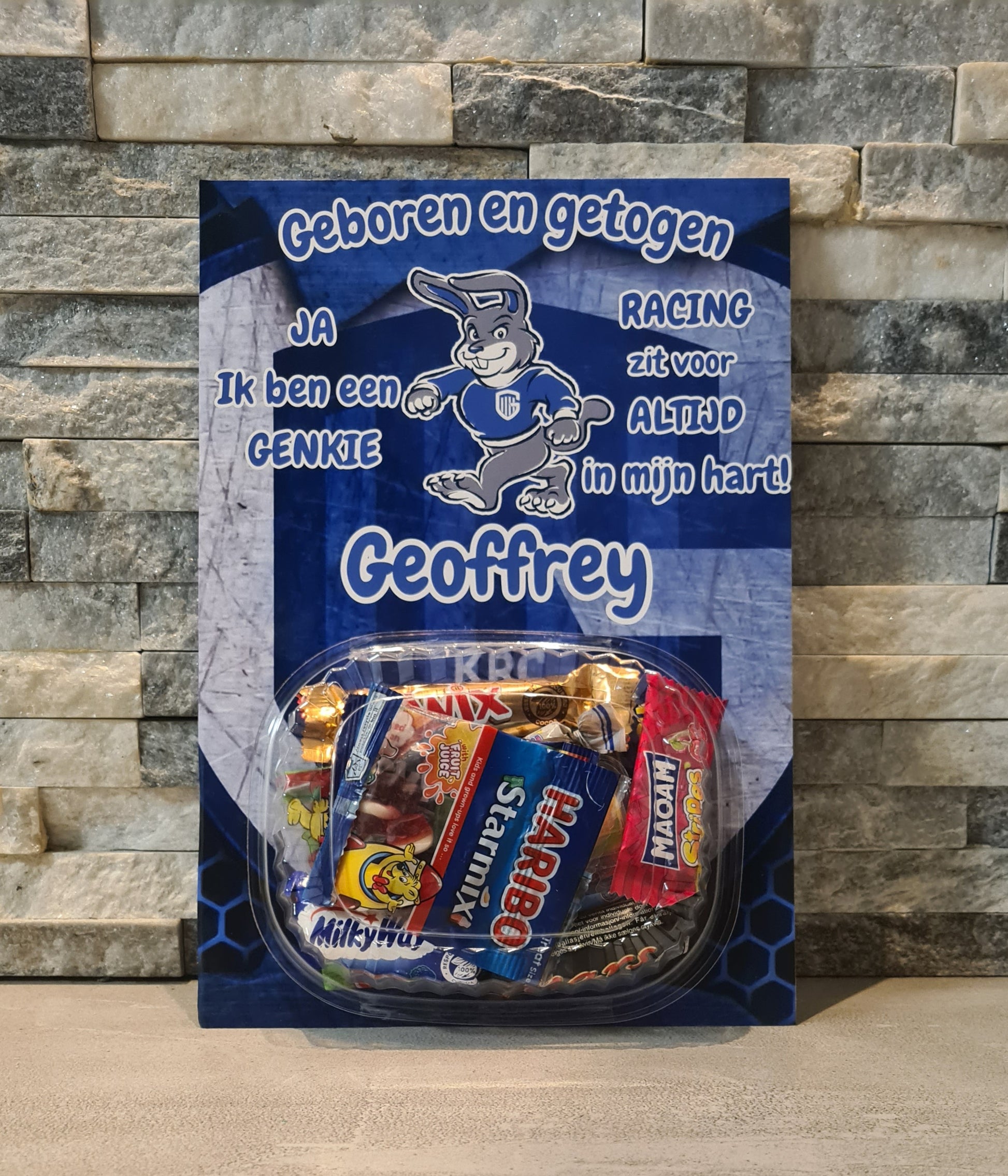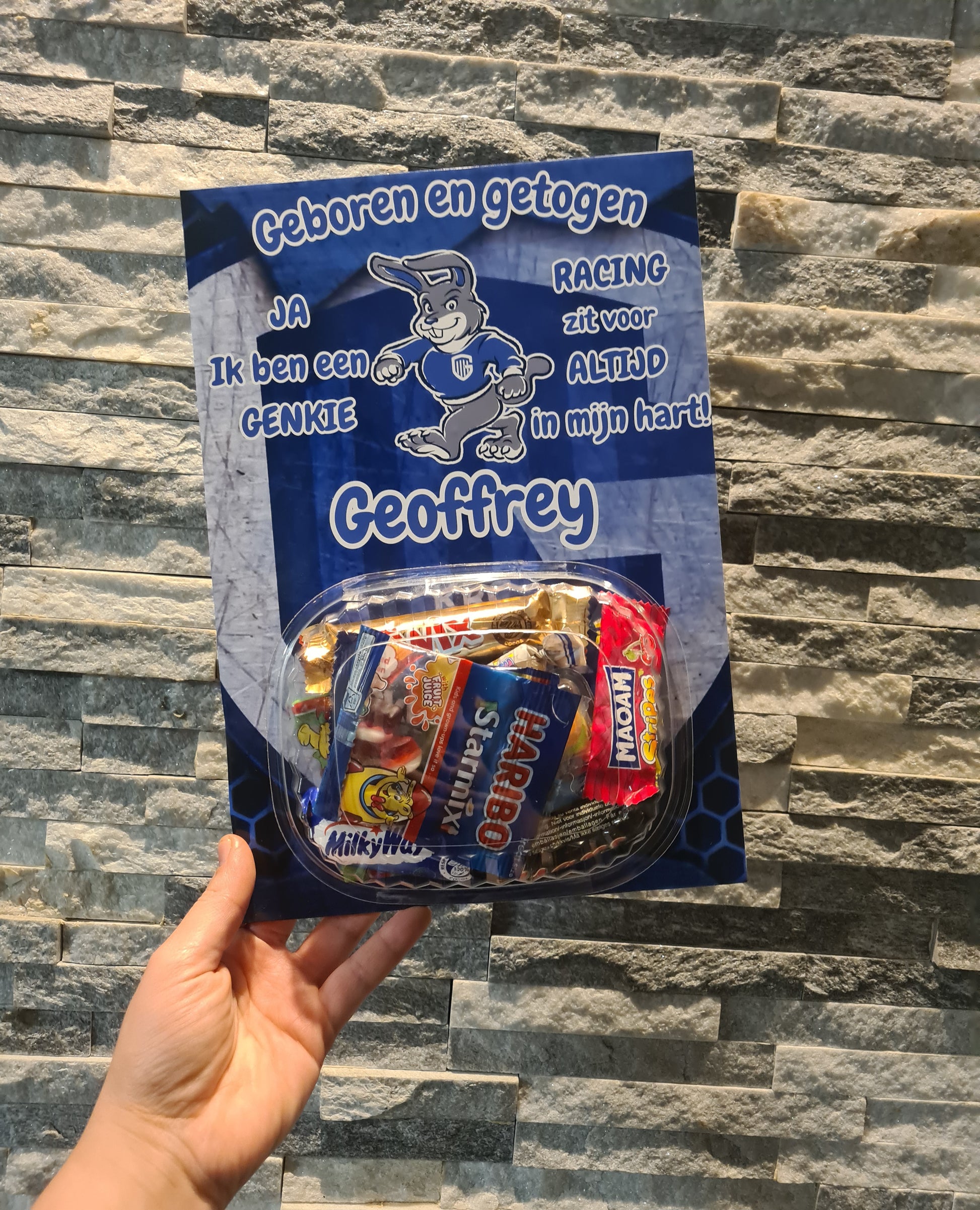 Het is een stevig, glanzend kaartbord met een leuke, persoonlijke boodschap (zelfs met je eigen foto of favoriete voetbalclub 😍) én heerlijk snoepgoed erbij. 🍬💖