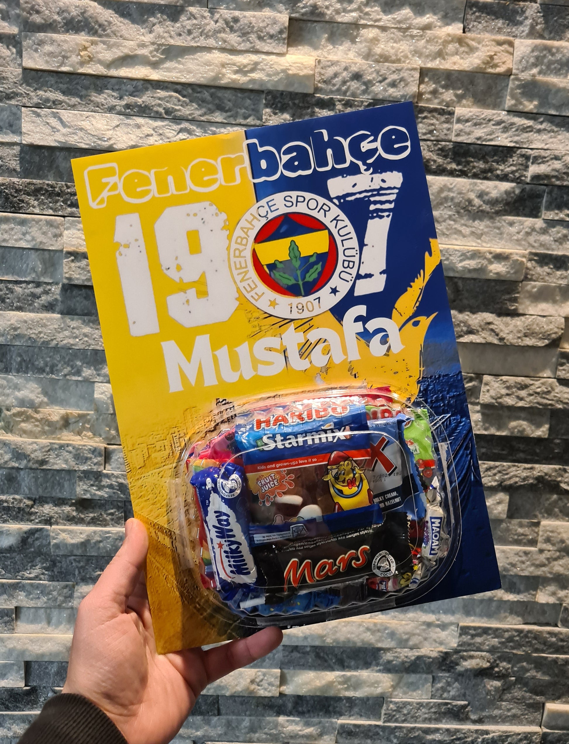 Het is een stevig, glanzend kaartbord met een leuke, persoonlijke boodschap (zelfs met je eigen foto of favoriete voetbalclub 😍) én heerlijk snoepgoed erbij. 🍬💖